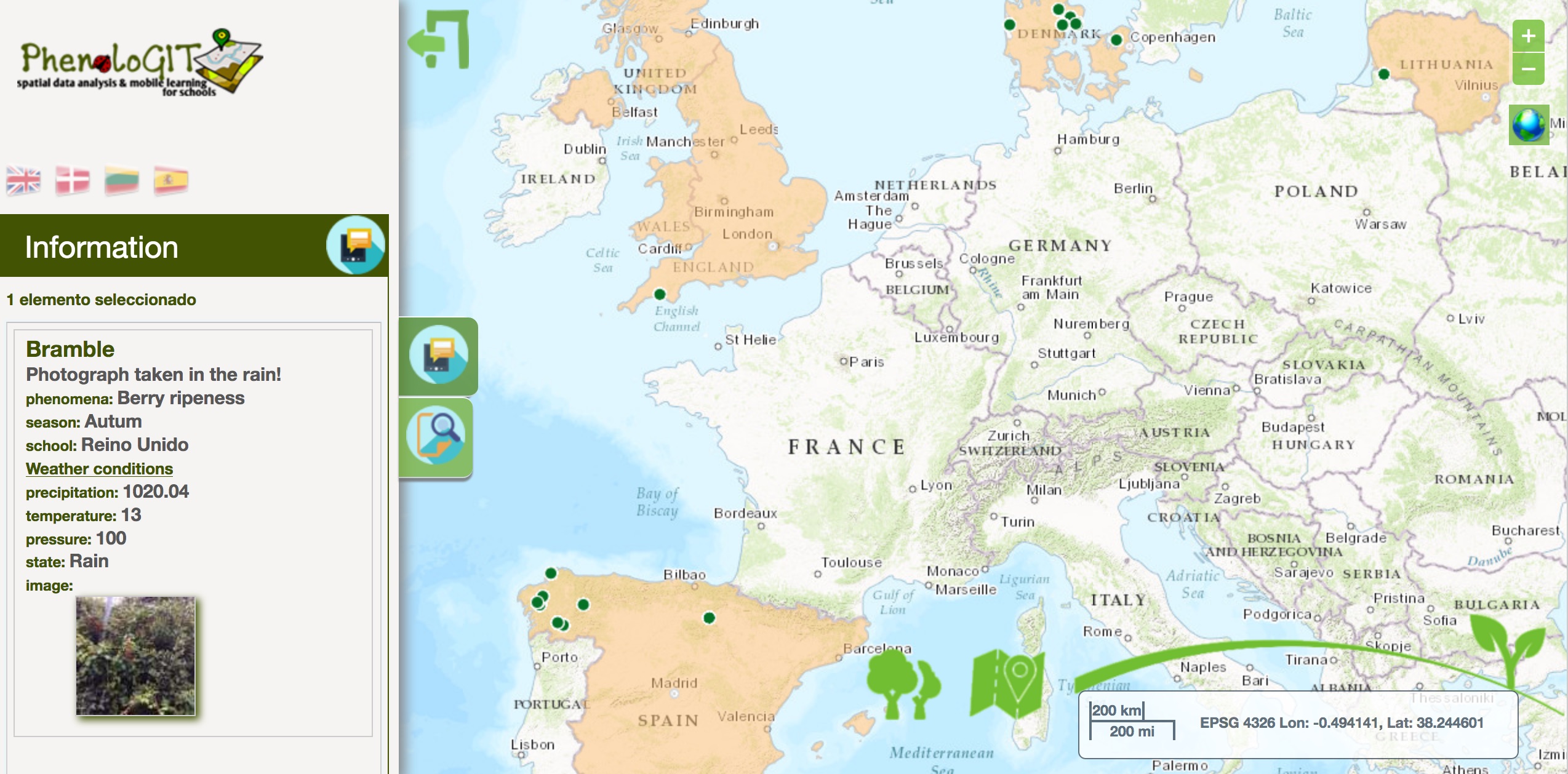 PhenoloGIT appNos próximos meses, os mestres europeos participantes experimentarán e propoñerán melloras para estas ferramentas, e desenvolverán propostas educativas para traballar cos seus alumnos, de acordo co seu currículo e contexto. Na primavera será cando finalmente estas propostas e ferramentas serán experimentados polo alumnado, que non só pode recoller e analizar información sobre as especies animais e vexetais na súa contorna, senon tamén contrastala coa dos seus compañeiros europeos, posto que ten unha capa social que permite aos usuarios interactuar coas observacións de outros.